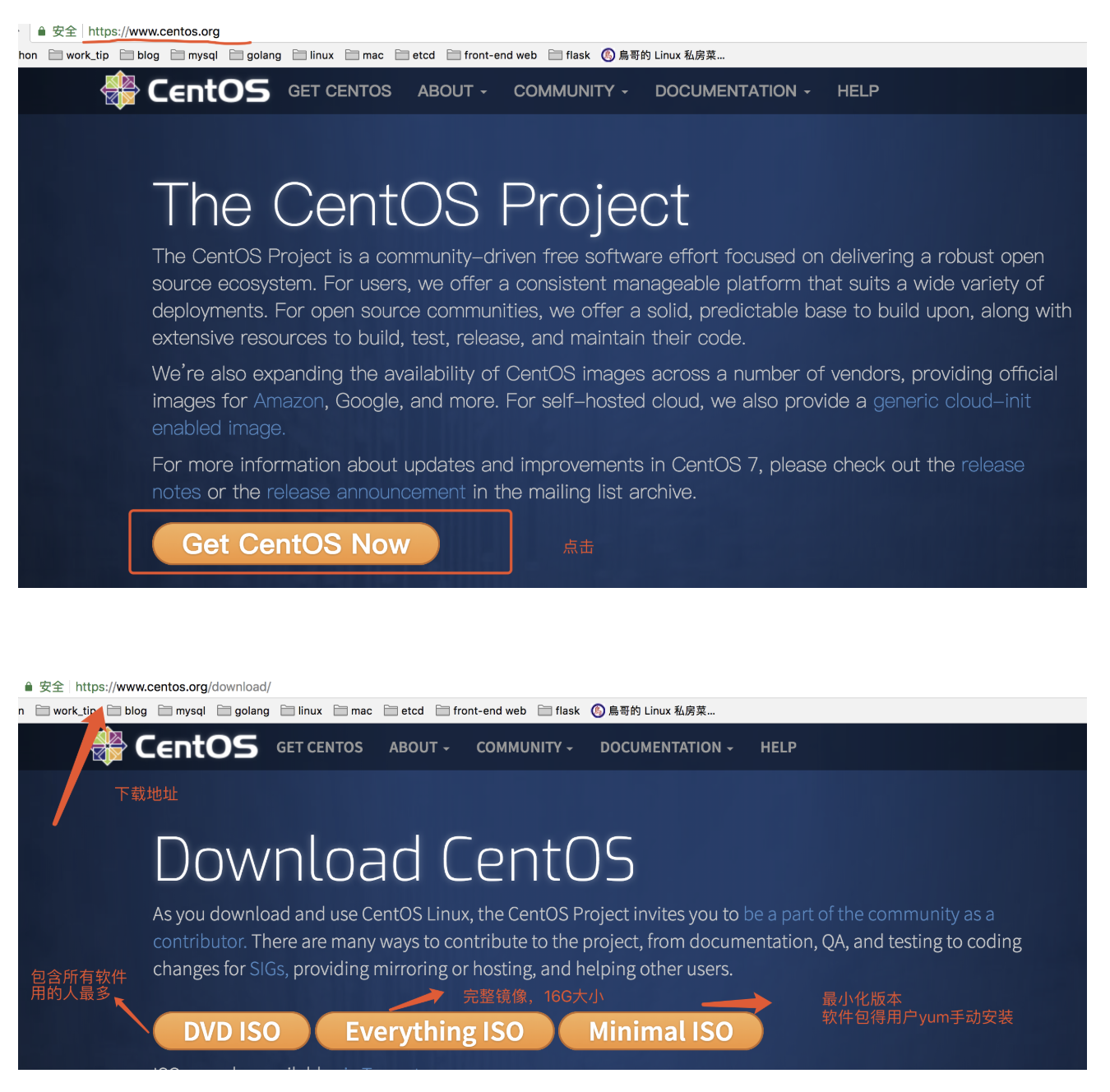 要安装centos系统,就必须得有centos系统软件安装程序,可以通过浏览器访问centos官网http://www.centos.org,然后找到Downloads - > mirrors链接,点击后进入下载,但是由于这是国外的网址,下载速度肯定受限。